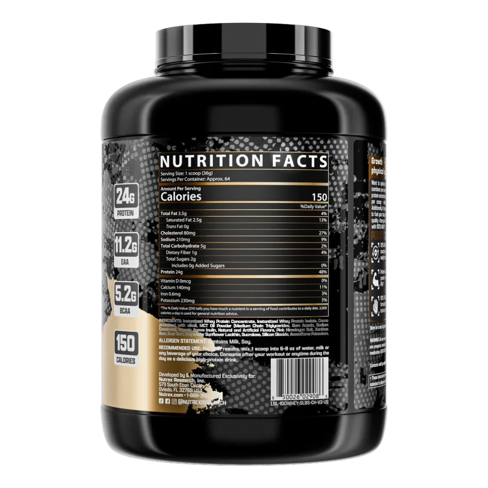 Nutrex Whey typically combines “whey protein concentrate + whey protein isolate” as its protein source.