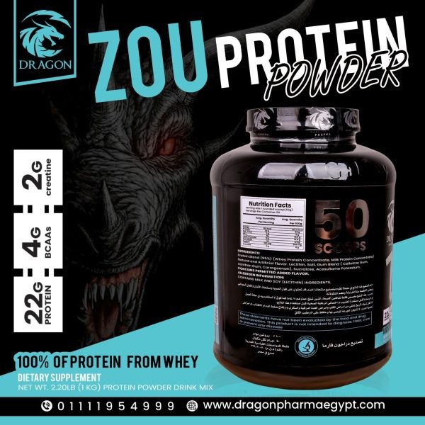 Dragon sells a product named “Zou Protein Powder 1 kg.” It is marketed as a whey‑protein (or milk‑/whey‑based) supplement — a blend of protein sources including whey concentrate and milk protein