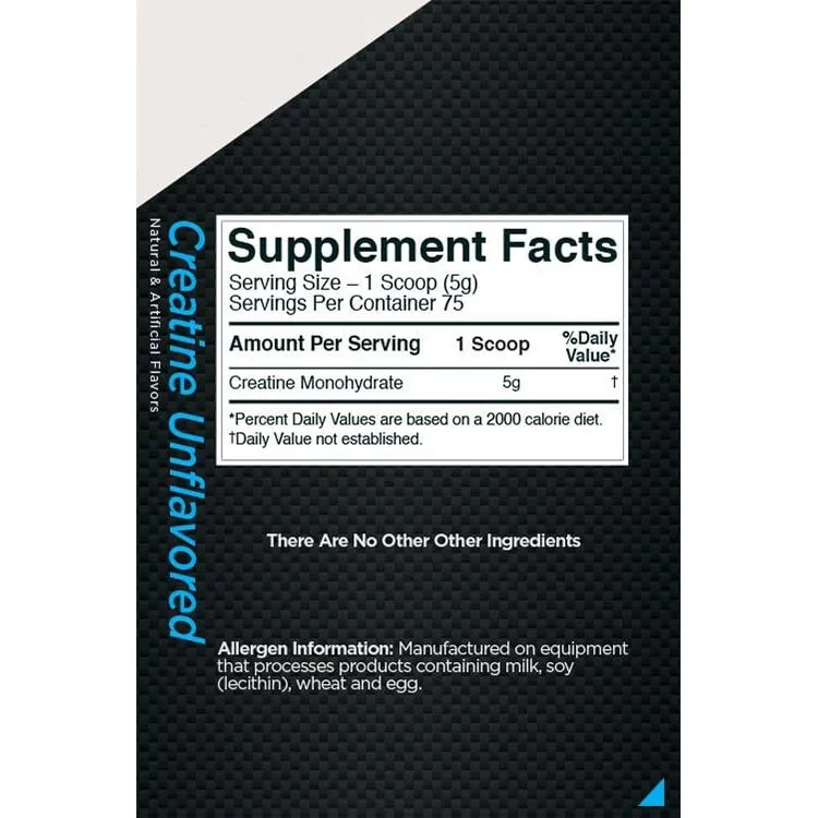 Commonly sold in tubs; each serving (one scoop) provides 5 g pure creatine monohydrate.